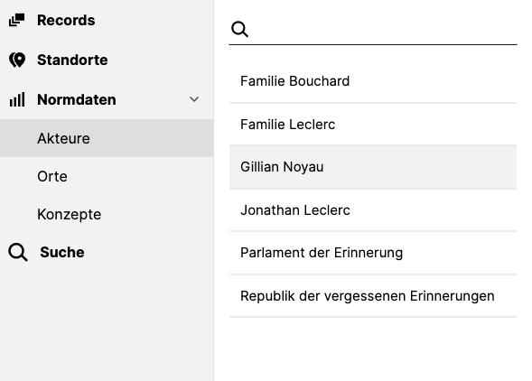 When you select „Locations” or one of the menu entries under „Authority data” from the menu, a list of entries appears.