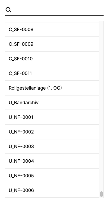 In the two further examples below, only buildings that contain parts of a national archive are listed under „Locations” on the left. The archive is newly established and does not yet contain entries for containers. In the following example, however, there are entries for some containers, as well as a tape archive and a rolling shelf system.