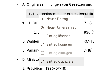 Some caution is advised when duplicating records, as all fields except for the internal number (stored in the refCodeAdmin field) are copied, including values that should actually be unique (such as the signature) or customised (such as the name of the archivist).