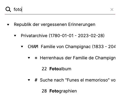 The hierarchy also expands so that a unit with a match becomes visible. Its ancestors, direct descendants („children“) and all records at the same level („siblings“) are revealed as well.